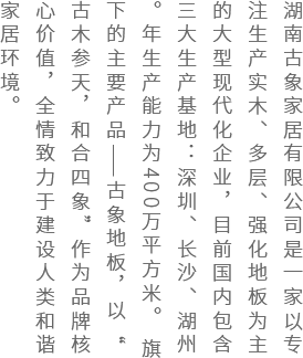 古象地板是湖南古象家居有限公司旗下的品牌,是專注于生產實木、多層、強化地板的木地板廠家,目前國內包含三大生產基地:深圳、長沙、湖州。年生產能力為400萬平方米。品牌成立多年以來,以強大的實力和盡善盡美的產品以及誠信經營獲得廣大用戶和合作伙伴滿意和信任,古象地板已經廣泛應用于國內各大城市的樓盤、酒店、公共區域。